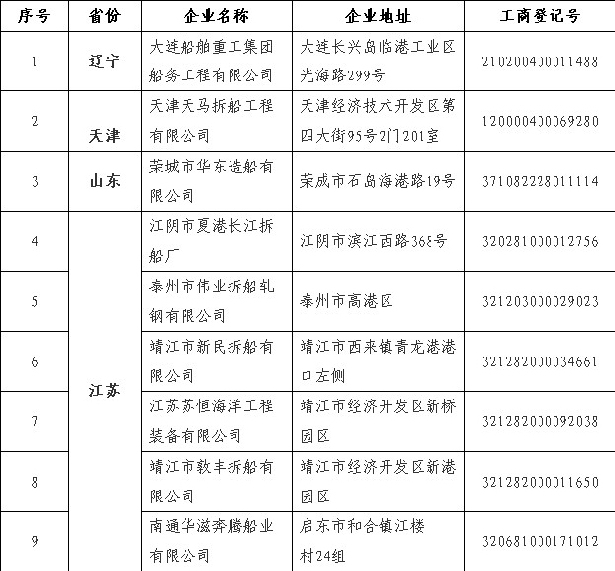 關于公布老舊運輸船舶和單殼油輪拆解企業名單的通知